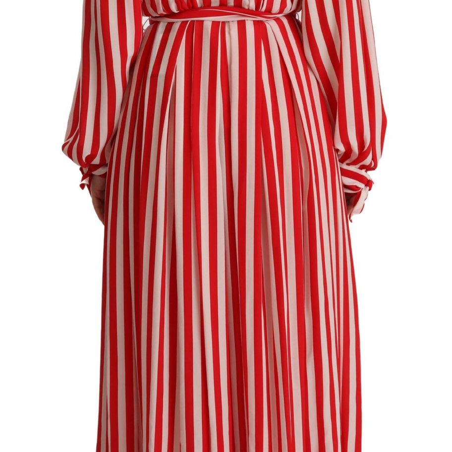 Exude timeless elegance in this gorgeous Dolce & Gabbana A-line maxi dress. This luxurious dress is perfect for any high-end event, featuring a sophisticated scarf collar and lovely long sleeves. The crisp white and bold red stripes create a striking look, while the premium silk material offers unmatched comfort and style. With expert Italian craftsmanship, this dress is sure to turn heads with every step. Complete with a convenient zipper closure and chic logo details, it’s a fashionable statement piece for those who demand the very best.